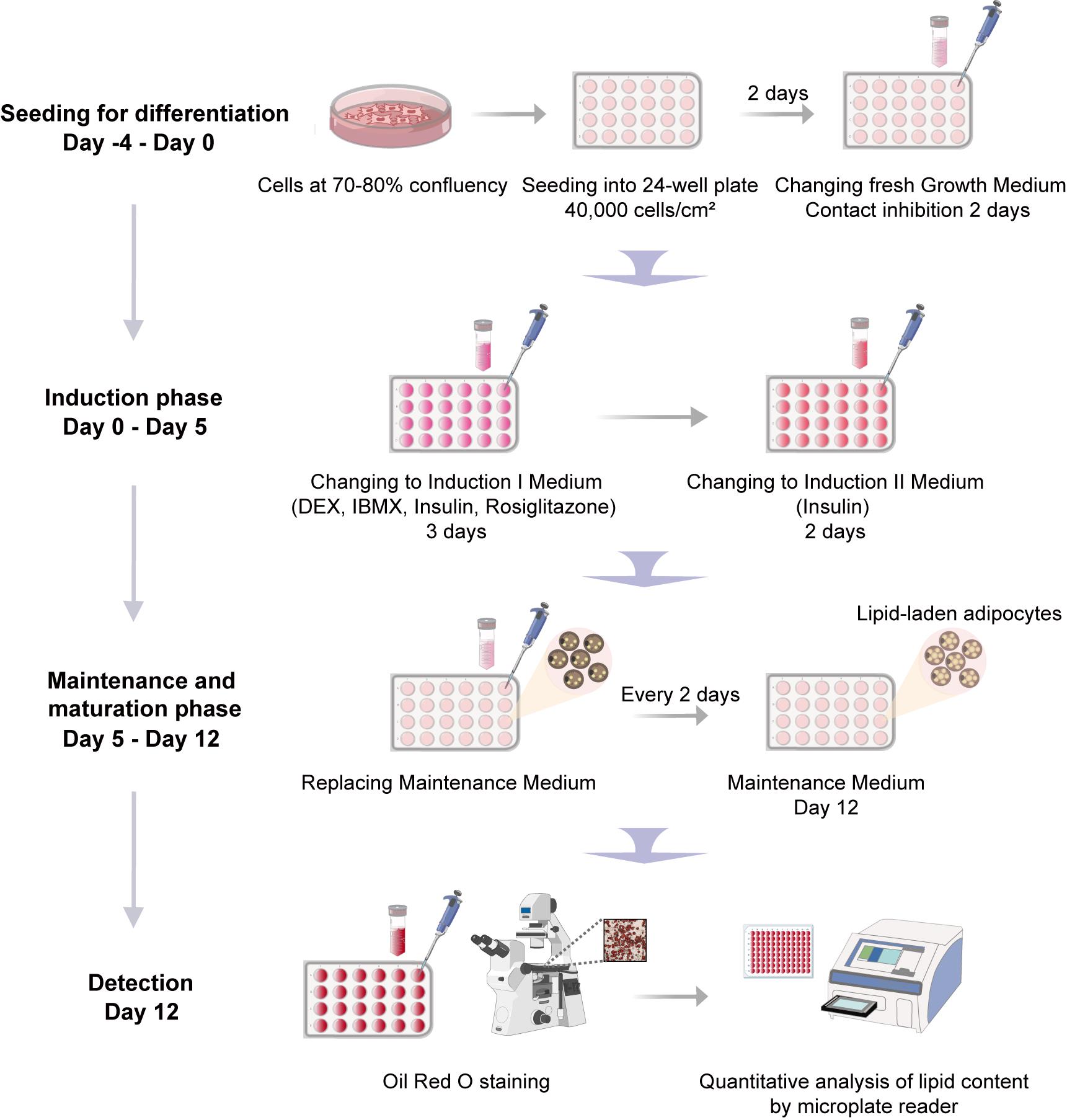4. Cell confluence: For efficient adipogenesis, cells must reach 100% confluence and subsequently undergo an additional 2-day period of contact inhibition prior to induction. Sub-confluent cultures at induction will result in poor differentiation efficiency.