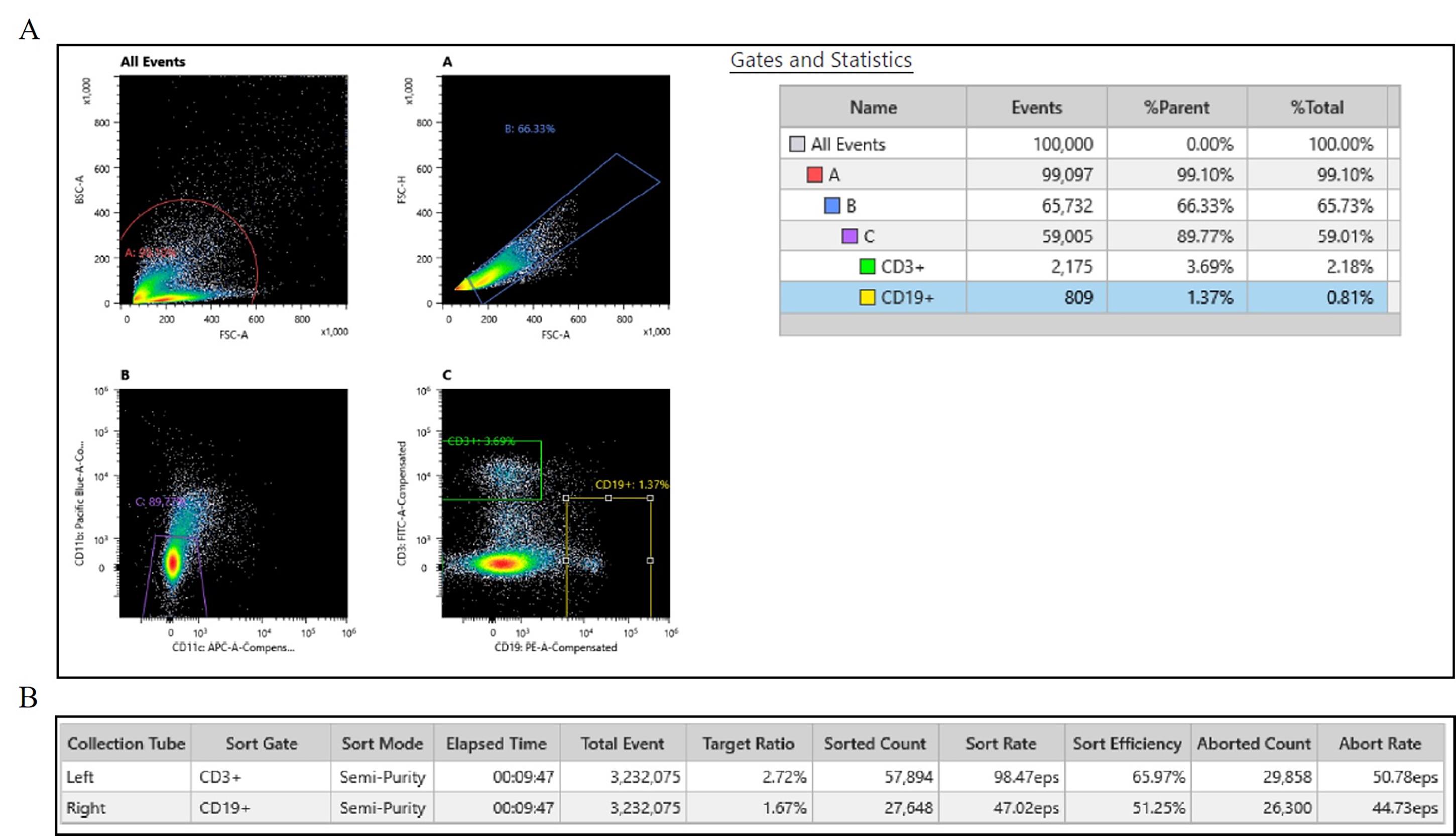Figure 2 shows representative images of nuclei imaged after performing the extraction protocol. Blood was collected in a serum-separating tube, centrifuged at 1300× g for 15 min to extract serum, and the blood clot was stored immediately at -80 °C. Nuclei that are round and intact can be used for downstream assays such as bulk ATAC seq, bulk RNA seq, sn-ATAC seq, sn-RNA seq, or multiome experiments. Figure 3 shows a representative flow cytometry gating strategy and statistics from cell sorting frozen lymphocytes without cryopreservation. Live/dead marker was not used due to the nature of the sample of interest being nuclei. Cells were gated first on BSB-H vs. SSC-H to remove debris, then SSC-A vs. SSC-H to isolate single cells, followed by CD11b and CD11c to remove monocytes (gating on the double-negative population); finally, gating was conducted on CD19- or CD3-positive to isolate B and T cells.