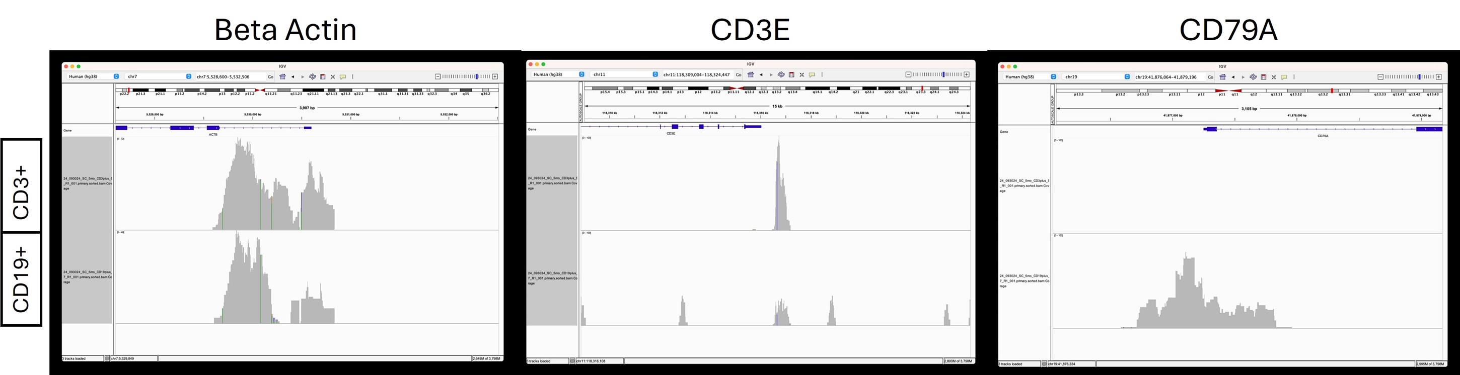 As seen in Table 2, the library prep for bulk ATAC-seq was successful and met quality score thresholds. The “% >= Q30 bases” metric indicates that both samples are greater than the 70% threshold for ATAQ-seq. The mean quality scores of 36.86 and 37.5 are indicative of a close to 1:10,000 probability of incorrect bases called, suggesting 99.99% accuracy. Figure 4 displays read depths of open chromatin regions from nuclei extracted from flow-sorted B and T cells. These peaks are indicative of the expected open chromatin signatures of these cell types. Together, this data suggests that isolation of nuclei from frozen blood clot without any cryopreservation, as outlined in this protocol, is successful, and meaningful sequencing data can be obtained from nuclei.
