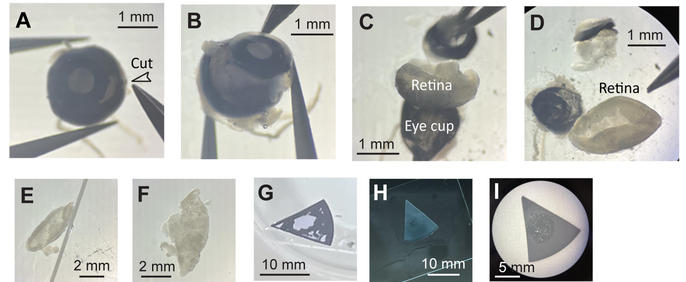 2. Use a paintbrush or fire-polished glass dropper to detach the retinal explant, then trim or flatten curved regions before reattaching to new filter paper.