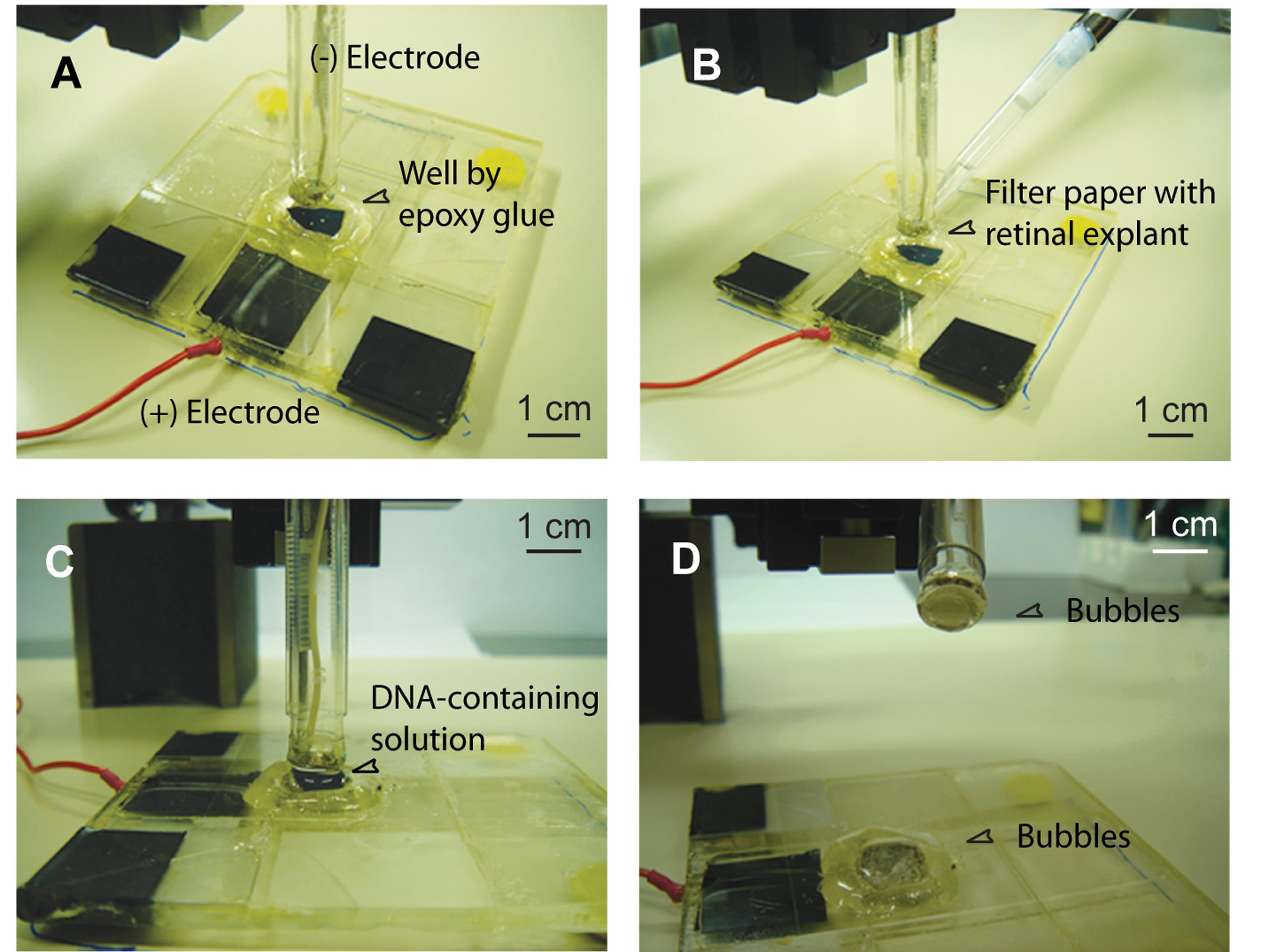 5. Confirm that the retinal explant is placed between the negative and positive electrodes, fully surrounded by the DNA solution (Figure 4C).