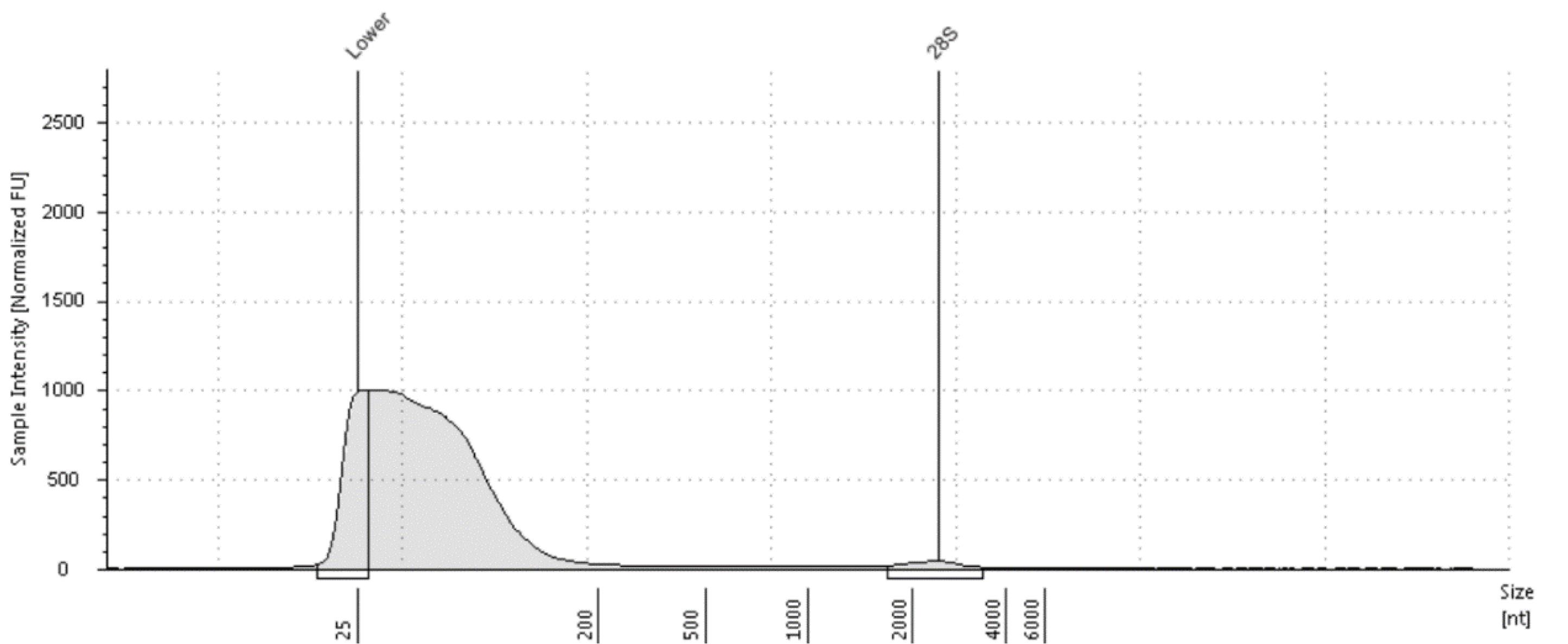 Figure 2. Typical example of a peak diagram in Agilent 4200 of successful fragmentation of RNA samples. A diffuse peak with a size of approximately 200 nt can be recognized.