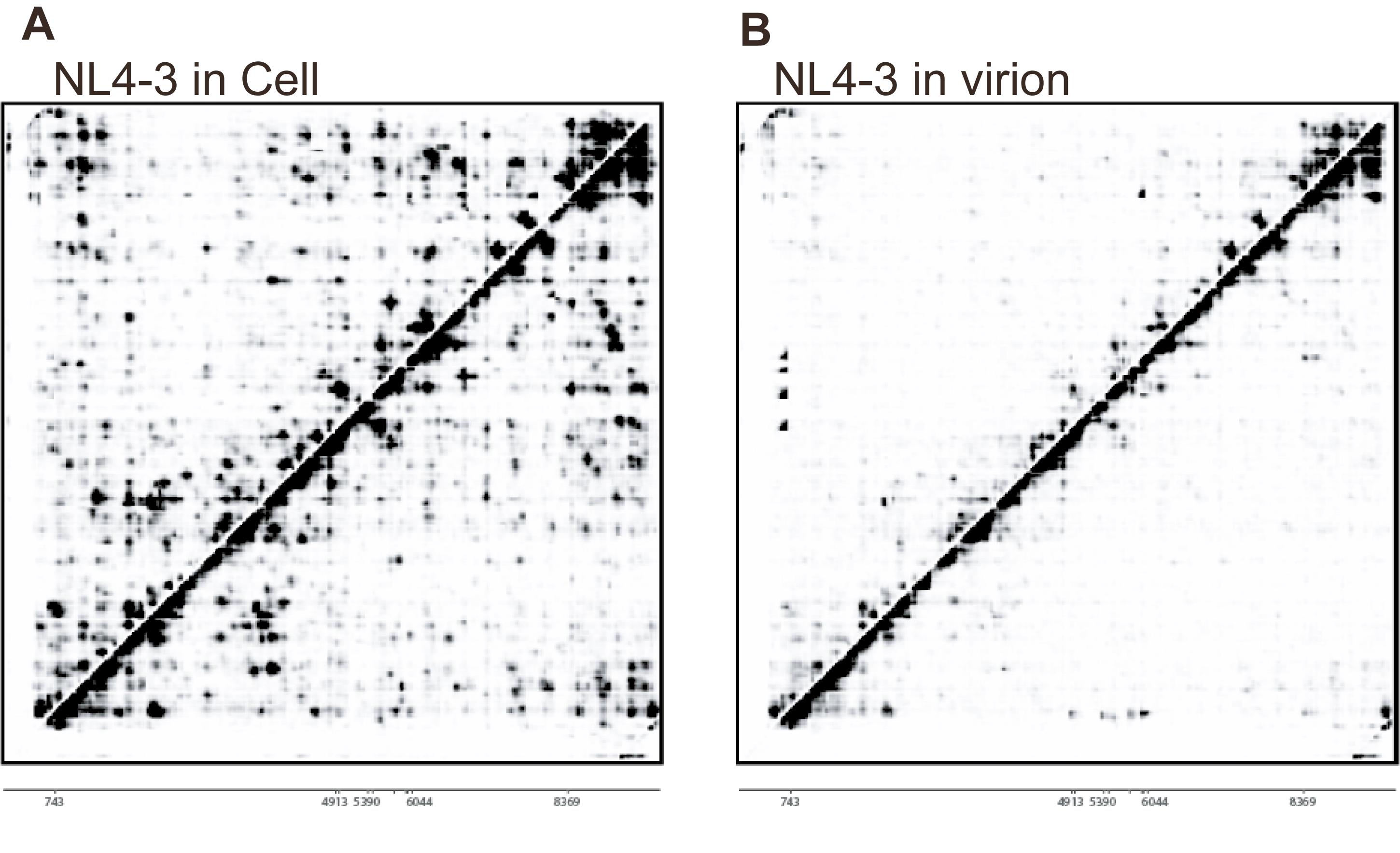 Figure 3. Visualization of a typical heatmap of the contact matrix. Heatmaps of the HIV-1 NL4-3 RNA contact matrix, showing interactions in vivo (A) and in virion (B). The X and Y axes represent the linear sequence coordinates of the RNA from 5′ to 3′. The color intensity indicates the normalized interaction frequency between two genomic regions. High-intensity signals represent strong interactions, indicating that these regions are spatially proximal. The heatmap shown here was generated by merging data from two normalized biological replicates and was visualized using Java TreeView software. This figure is adapted from our previous publication: Zhang et al. [1], Mapping HIV-1 RNA Structure, Homodimers, Long-Range Interactions and persistent domains by HiCapR, originally published in eLife, https://doi.org/10.7554/eLife.102550.3.