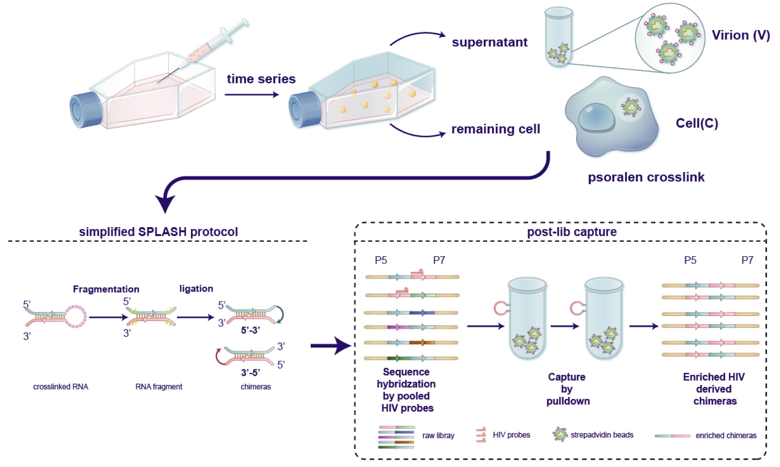 Overview and procedure scheme. At the appropriate time point, collect both the supernatant containing live virus and infected cells for psoralen crosslinking treatment. Subsequently, process the crosslinked RNA using a simplified SPLASH protocol. After RNA fragmentation and ligation reactions, obtain chimeric fragments for library construction. Following library capture and post-processing, hybridize the RNA library with specific probes designed for the target virus (HIV-1 in this experiment), to capture and enrich the chimeric fragments. Reproduced from Zhang et al. [1], Mapping HIV-1 RNA Structure, Homodimers, Long-Range Interactions and persistent domains by HiCapR, originally published in eLife, https://doi.org/10.7554/eLife.102550.3. This figure is made available under a Creative Commons Attribution 4.0 International license (CC BY 4.0).