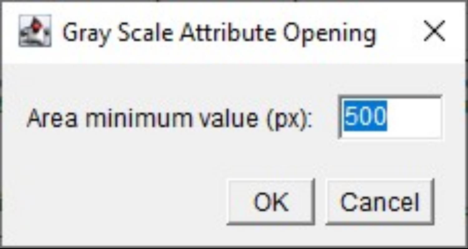 CRITICAL: The minimum value of the attribute, expressed in pixels, should be optimized for the images by the operator. It is a specific command of the MorphoLibJ plugin in Fiji that aims to remove components of the grayscale image based on a certain size criterion, rather than on intensity. We set up the Gray Scale Attribute Filtering steps using ”opening” as a morphological size operation and “area” (number of pixels) as an attribute [8].