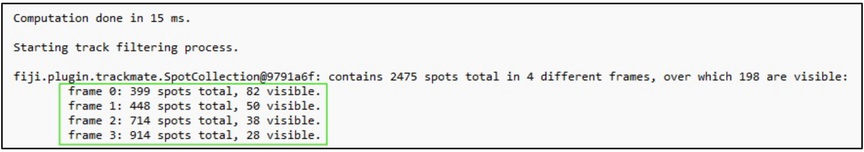 Specifically, the log file generated for each concatenated image analyzed reports, for every time point of the concatenated image (defined as frame 0, 1, 2, etc.), the “spots total”, corresponding to the total number of cells detected by the plugin, and the “visible” spots, corresponding only to the cells that meet the selection criteria defined by the operator (Figure 8).