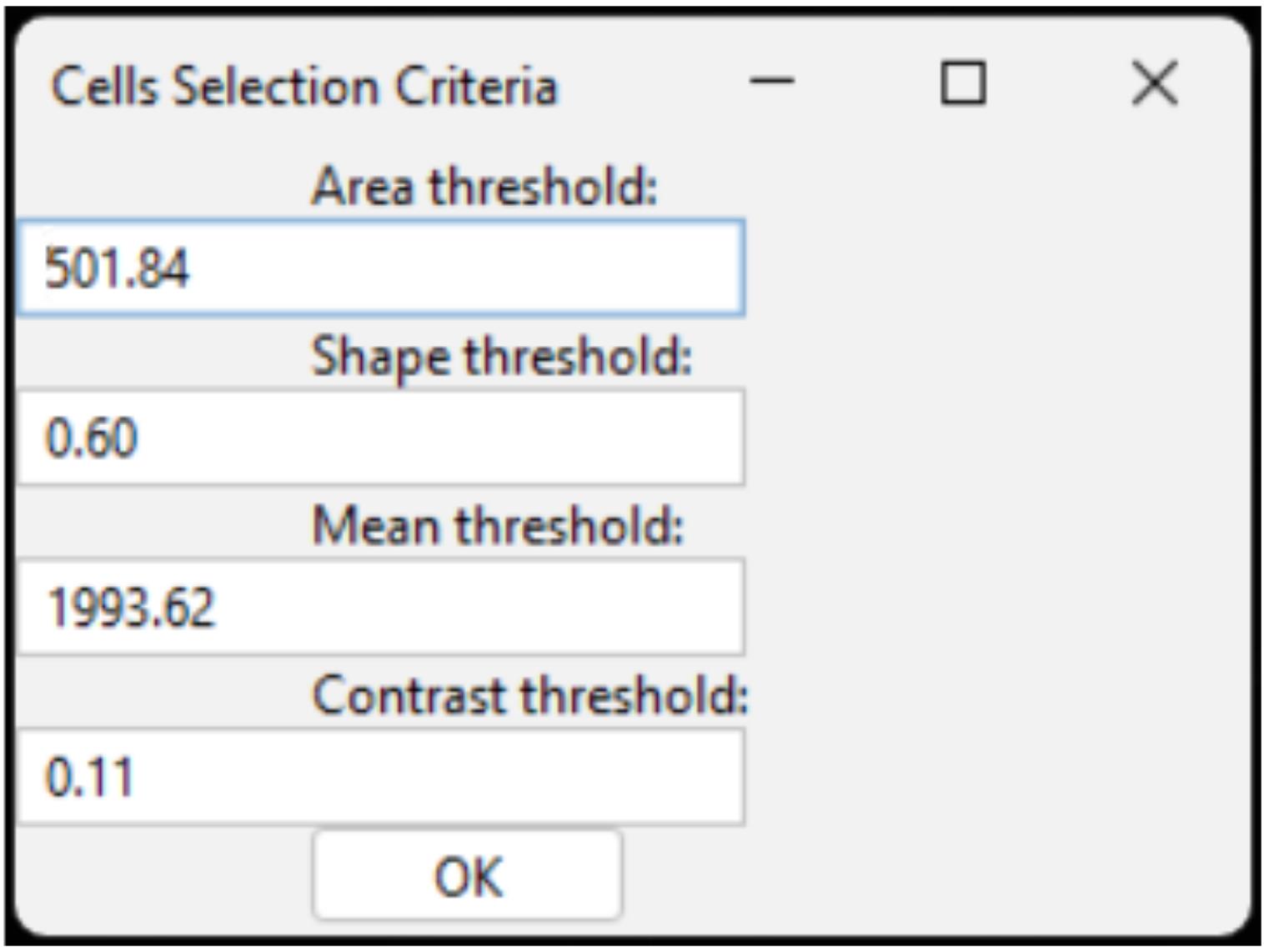 3. Upon execution, the macro displays a window where the user enters four values using four separate text fields, one for each selection parameter (area, shape, mean intensity, and contrast) (refer to step K2.1.4a for further details).