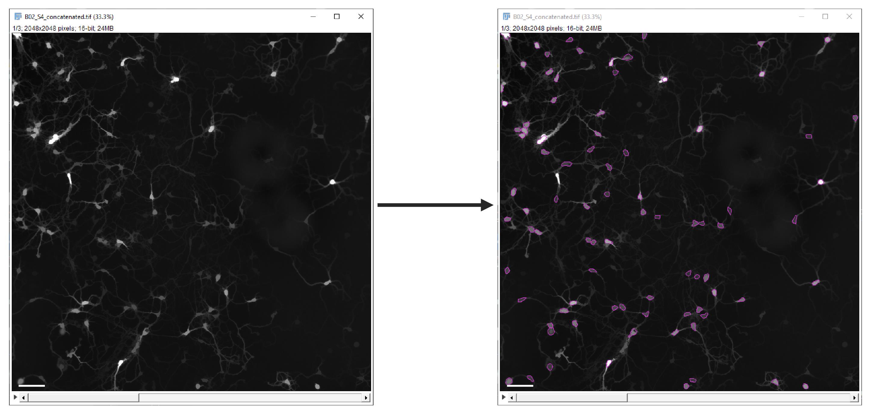 Two macros, “no_loop” and “loop”, are available for survival analysis. Developed in Jython (.py), both are fully automated tools intended to quantify neuronal survival over time using morphological and intensity-based criteria. Specifically, the macros use the pre-trained StarDistDetectorFactory segmentation model [11] as a detector within Fiji’s TrackMate plugin [12] to segment single cells in the images. Please note that the TrackMate plugin does not require a separate download as it is already bundled with Fiji.