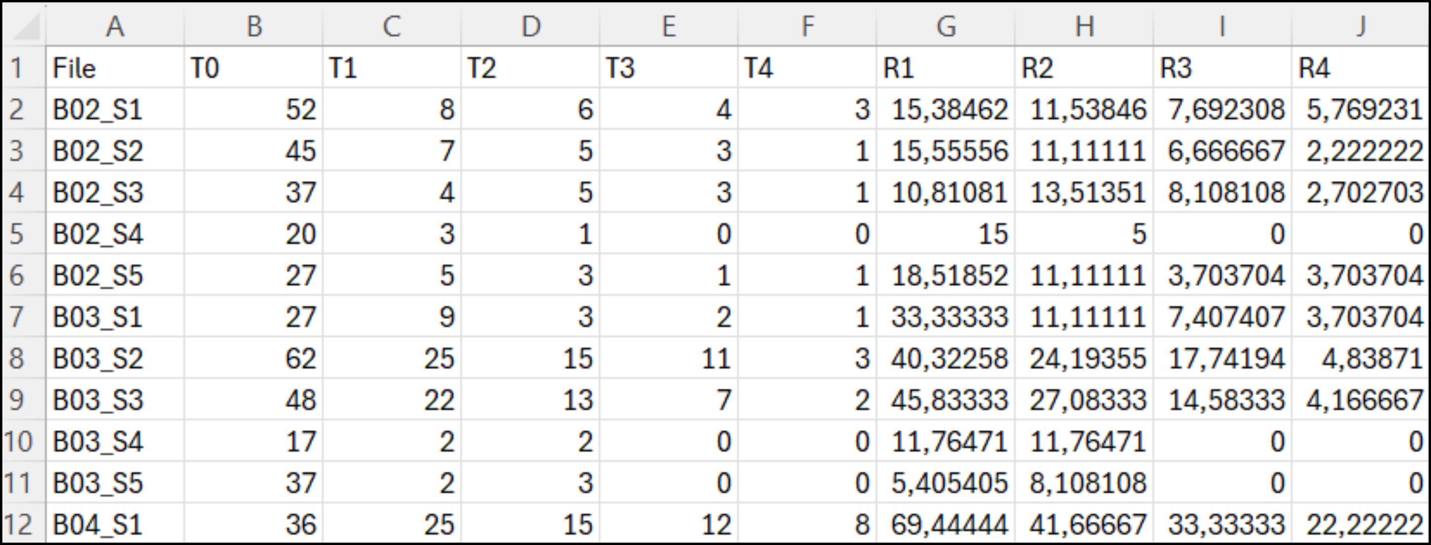 8. The results are summarized in a table where each row contains the image name, the number of visible spots at each time point (T0, T1, T2, …), and the corresponding ratios (R0, R1, R2, …; with Rn = T0/Tn).