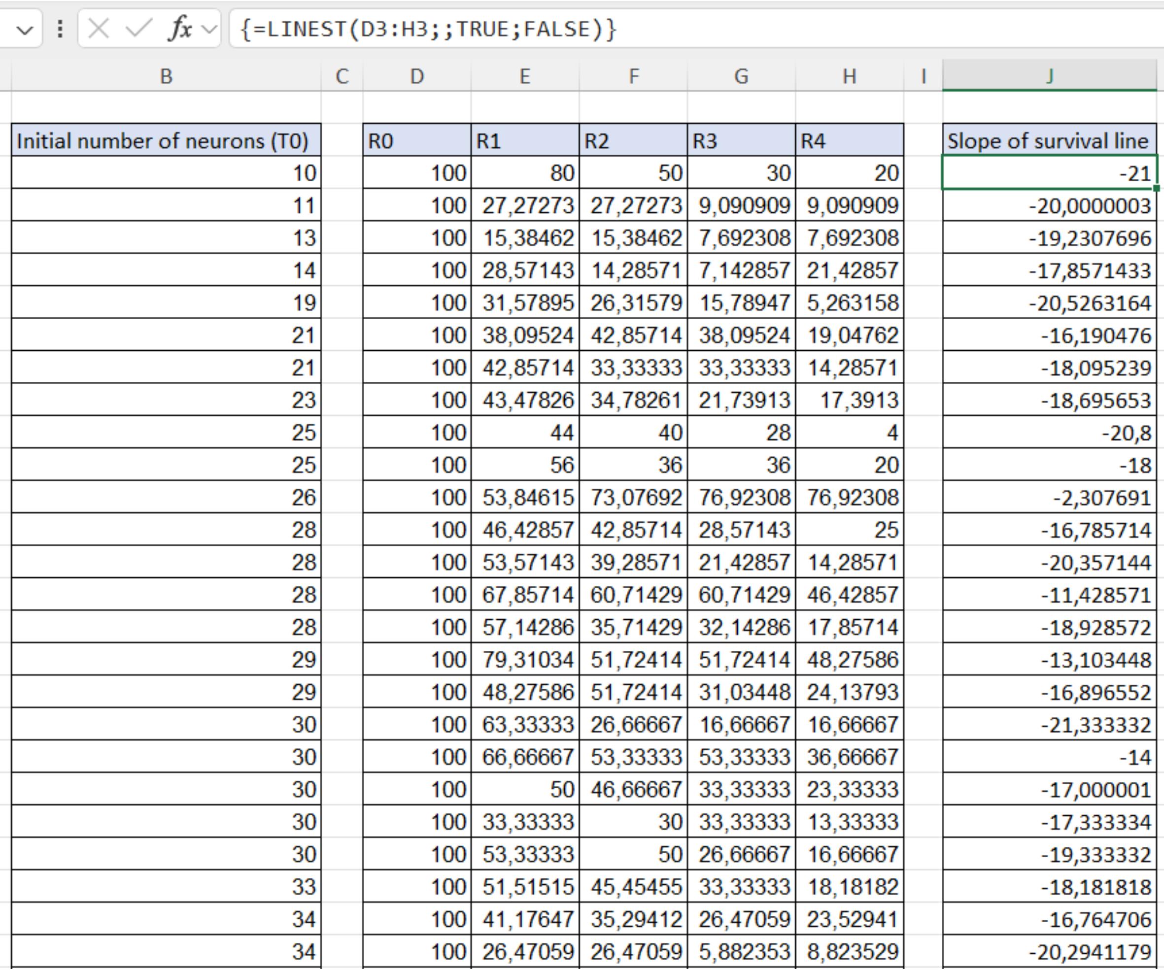 2. From the .csv file, extract all the data referring to the treatment control and create a file with the initial number of neurons (T0) and all the related ratios (R0-Rn) for each FOV. Calculate the slope of the survival lines by applying linear regression on the data for each FOV, to obtain a simple parameter proportional to the rate at which the neurons are dying (Figure 14).