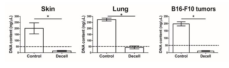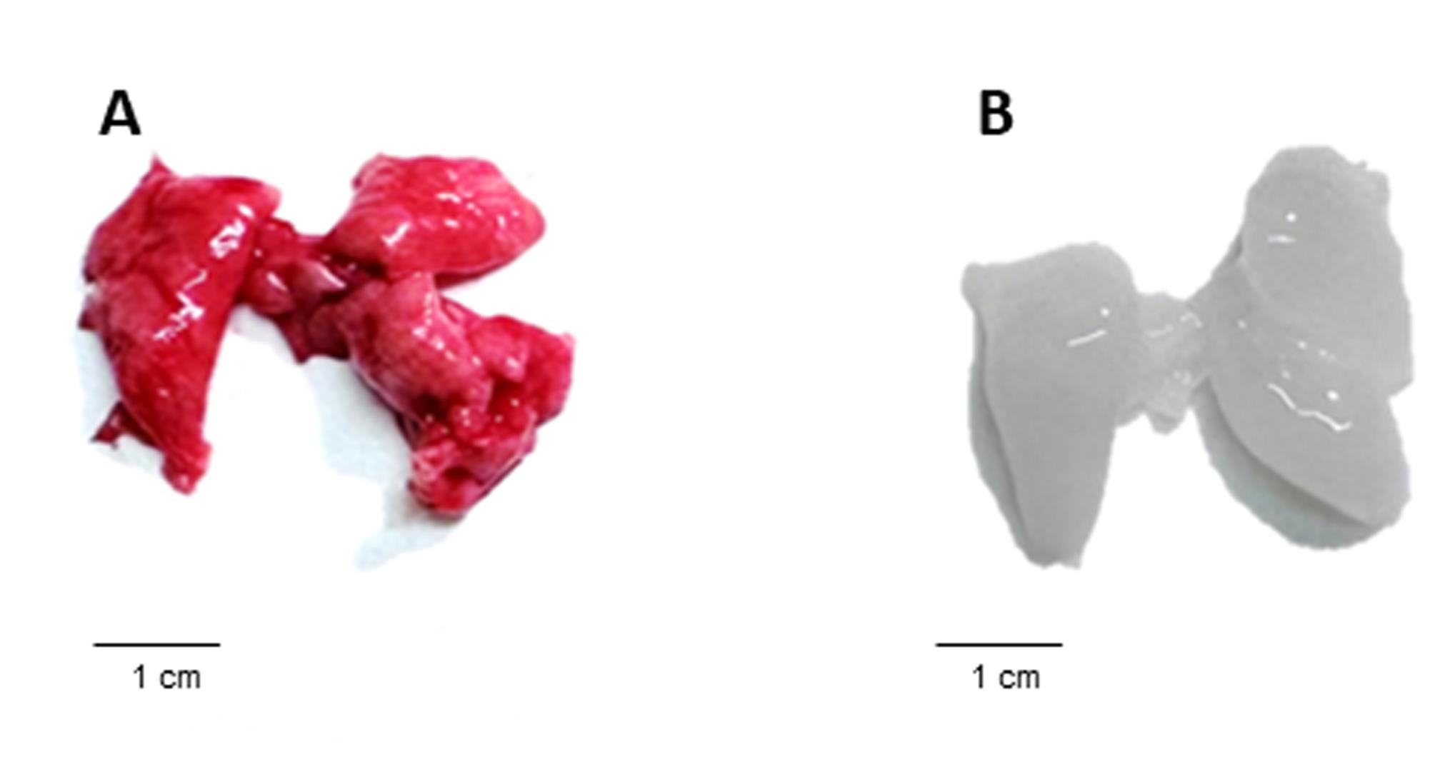 Note: An example of a successful decellularization process in lungs is provided in Figure 1, where the lungs no longer appear reddish. In addition, the decellularization process can be evaluated using hematoxylin and eosin (H&E) staining to determine the lack of nuclei and cells in the decellularized tissue (Figure 2). Moreover, additional validation for the decellularization process can be done by analyzing the content of DNA in the decellularized tissue (Figure 3).