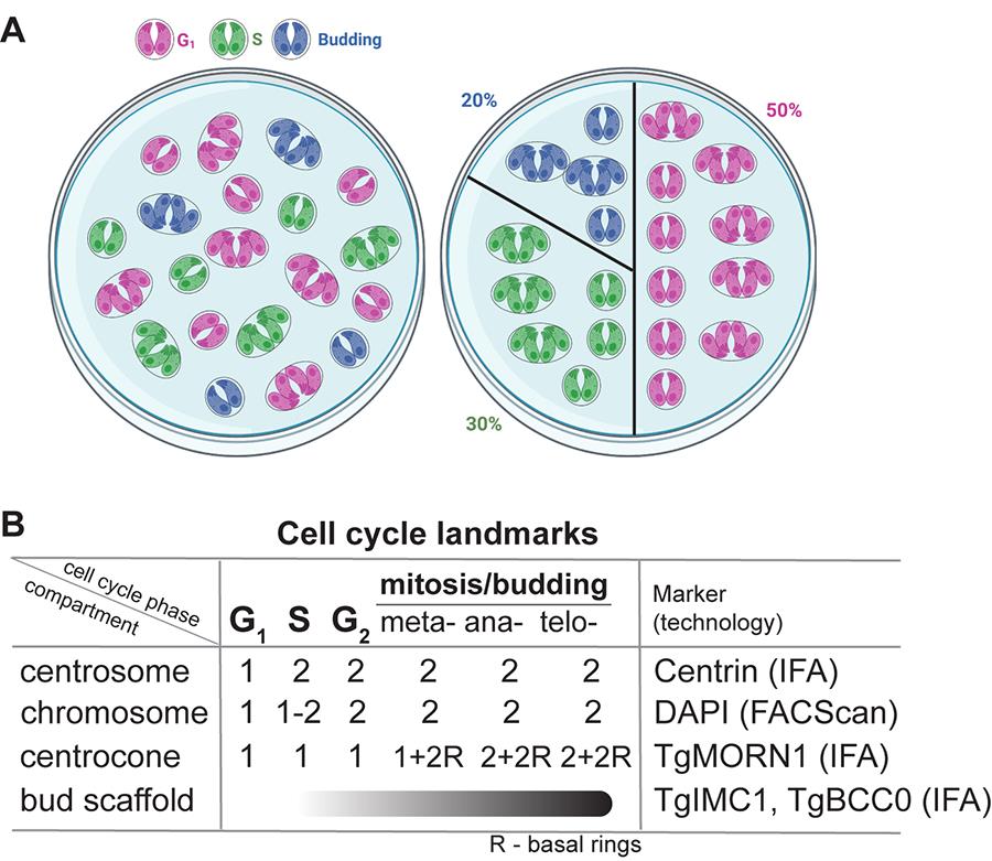 Note: Tachyzoites maintain relative cell cycle synchrony within the vacuole. Yet, parasite populations are asynchronous, and the fraction of vacuoles in each cell cycle stage reflects the time parasites spend in each stage (Figure 1A). For example, the tachyzoite cell cycle is composed of ~50% G1, 30% S, and 20% of vacuoles undergoing overlapping mitosis (M) and budding (C, cytokinesis) [10,26,27]. Therefore, a random 100 vacuoles will represent a combination of ~50 vacuoles of parasites with a single centrosome (G1), ~50 vacuoles of parasites with duplicated centrosomes (S + G2 + M/C), of which ~15–20 vacuoles of parasites will have variable size buds (M/C), and ~10 vacuoles will have parasites with basal rings attached to a single or a duplicated centrocone (meta- and anaphases of mitosis) (Figure 1B).