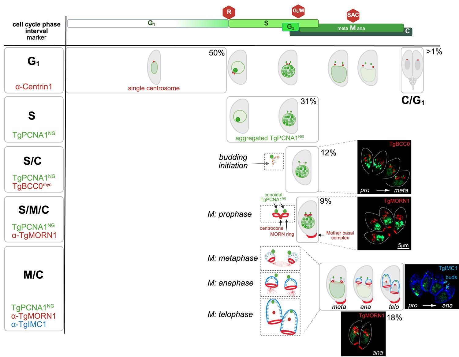 d. S/M/C interval: Stain ToxoFUCCIS parasites with anti-TgMORN1 antibodies. The TgMORN1 localizes to the spindle compartment centrocone and basal complex, representing the parasite cytoskeleton. Quantify 500 parasites with aggregated nuclear TgPCNANG (active DNA replication) and determine the fraction of the parasites that have a single centrocone with two MORN1 rings (basal complexes of the future buds), likely representing a prophase of the mitosis (Figure 2, S/M/C panel).