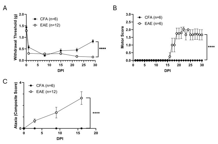 Figure 1. Non–pertussis toxin (PTX) immunization develops multiple sclerosis (MS)-associated behavioral phenotype. Male mice were immunized with myelin oligodendrocyte glycoprotein (MOG) emulsified in complete Freund’s adjuvant (CFA) at DPI (days post immunization) 0 or with CFA (control). (A) Mechanical allodynia was evaluated weekly using a von Frey test over a period of 30 days. Experimental autoimmune encephalomyelitis (EAE)-immunized animals have significantly decreased withdrawal threshold, indicating the development of neuropathic pain-like symptoms. (B) Clinical scores were evaluated daily to assess paresis until DPI 30. 50% of the EAE-immunized mice developed paresis. (C) Ataxia was measured using a composite scoring system, and non-PTX EAE immunization led to ataxia development. Data is presented as mean ± SEM, ****p < 0.0001. Data were analyzed using GraphPad Prism 10.0. Normality tests determined the use of appropriate statistical analyses. von Frey and ataxia data were analyzed by two-way ANOVA (α = 0.05) with model as the between-subjects factor and time as the repeated measure. Paresis severity was evaluated using the area under the curve (AUC) across all measurement days, with significance assessed by an unpaired t-test. P values less than 0.05 were considered significant.