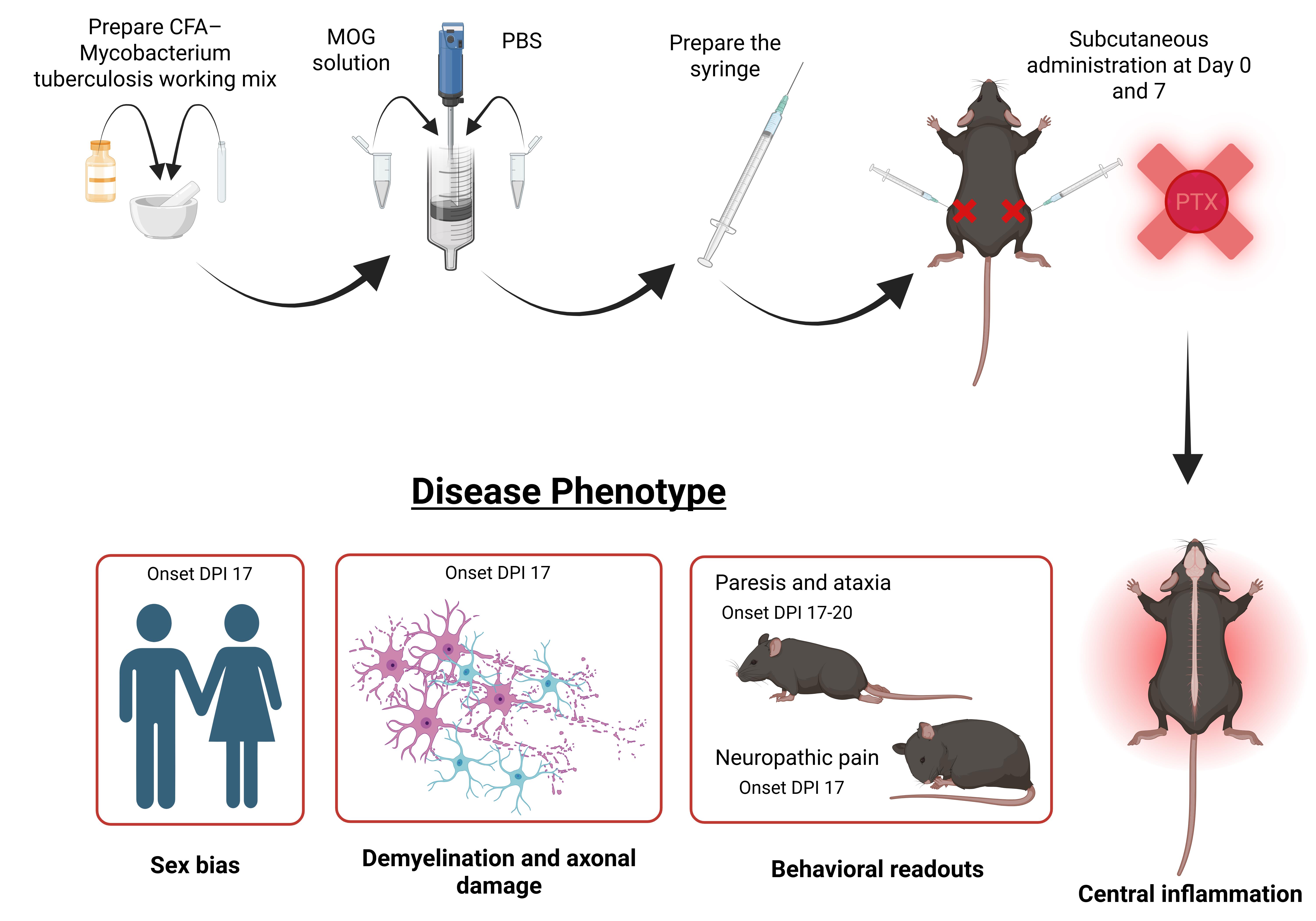 • Recapitulates hallmark MS pathology, including neuroinflammation, demyelination, axonal injury, and neuropathic pain.