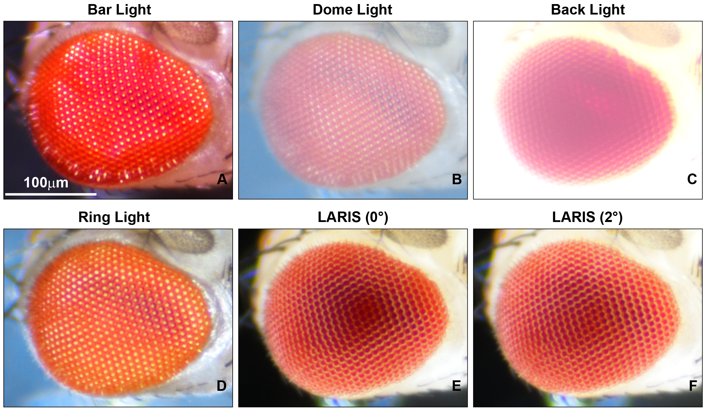 The LARIS method provides better contrast of ommatidial structure, orientation, and pigmentation status than what is obtained by conventional imaging methods of the Drosophila compound eye. A comparative analysis of different approaches used in eye imaging of Drosophila is given in Table 1. Here, we provide a detailed protocol for the LARIS method to image compound eyes of adult flies or other insects.