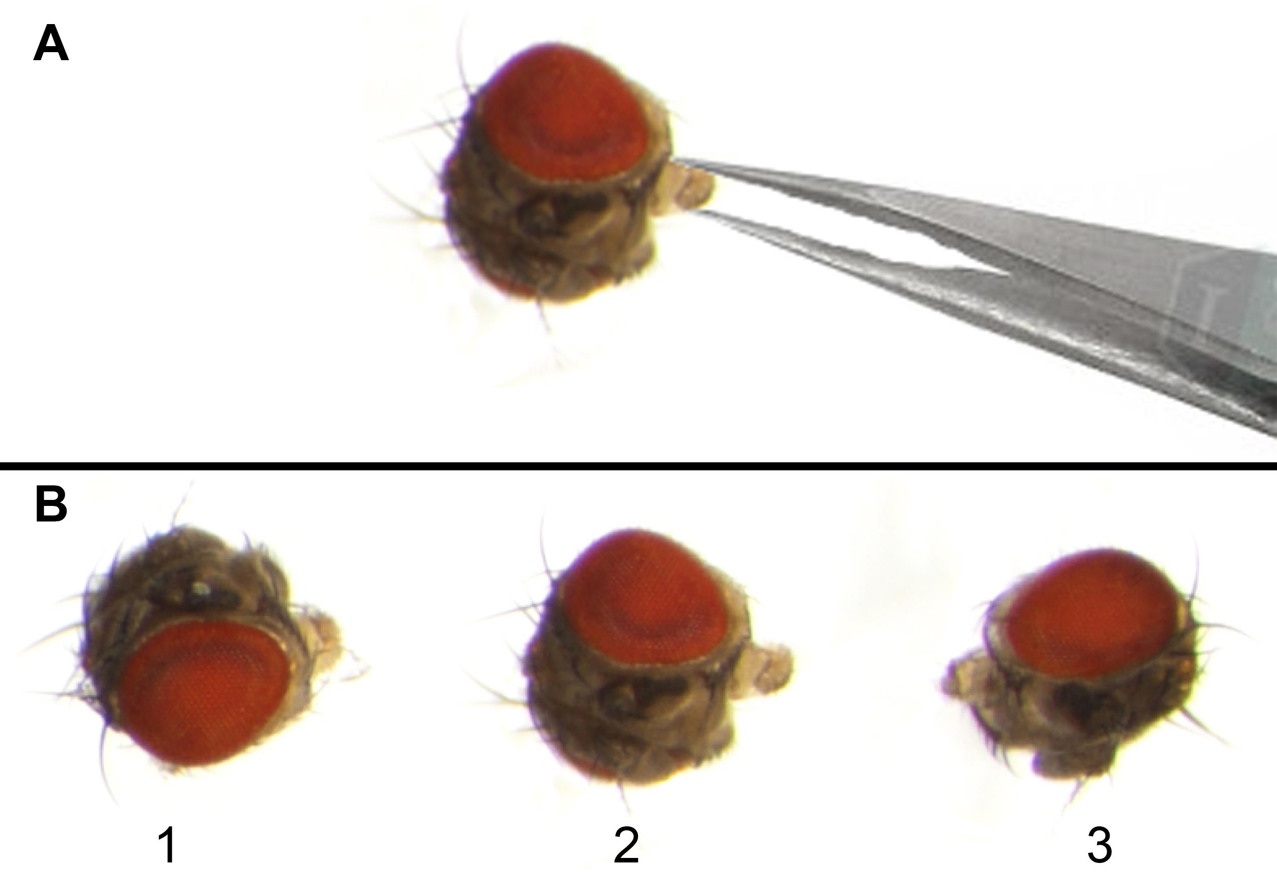 6. Hold the mouthparts of the fly head with fine forceps and place one side of the fly head, specifically the eye region, on a small drop of nail polish (Figure 2A).