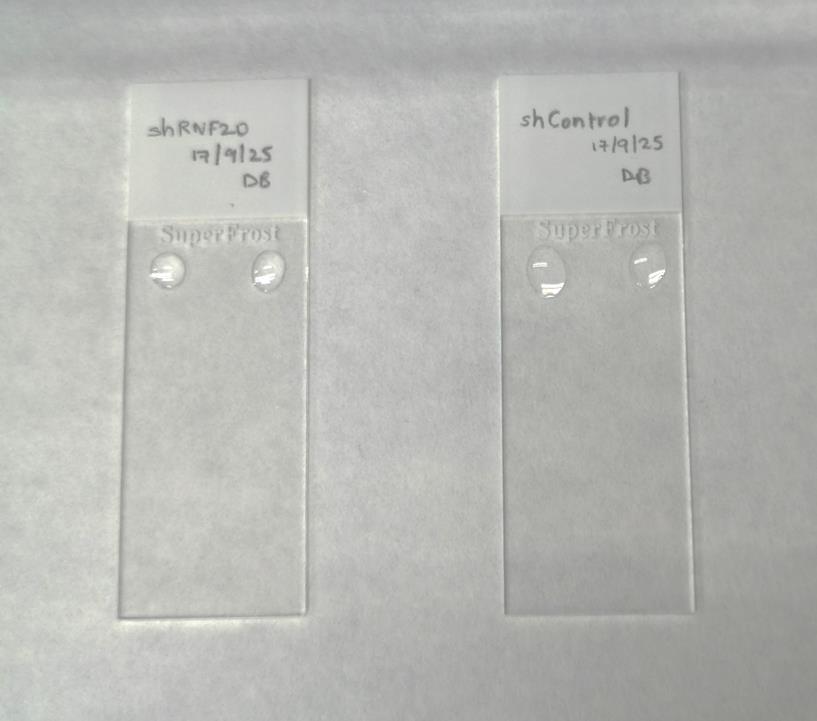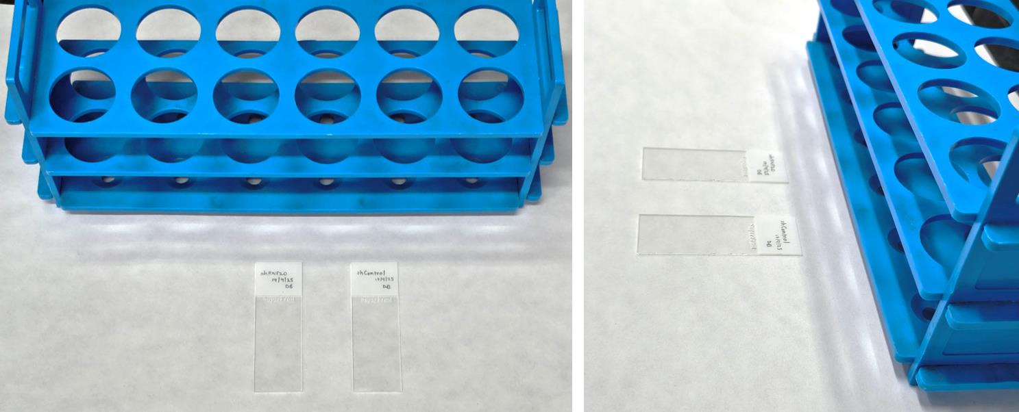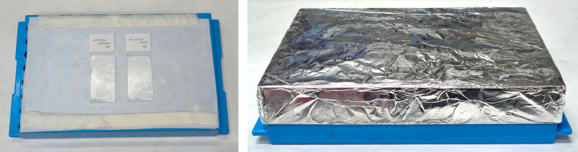 27. Keep the slides in a slanted position on the centrifuge tube rack and cover them to prevent light exposure. Allow slides to dry completely by leaving them at RT for 30 min.