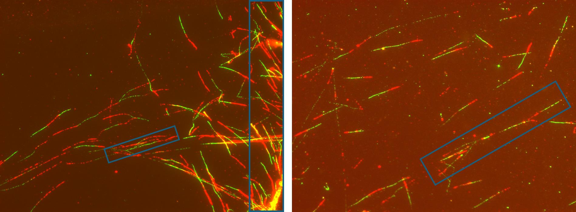 1. This step varies according to the microscope you are using. To locate the focus of the DNA fibers, find a field that shows fluorescent speckles. Your fibers will be on the same plane as these fluorescent dots. Next, move the objective lens along the width of the slide to find fibers as shown in Figure 6. Once the fibers are visible, move the objective lens along the length of the slide and capture a sufficient number of images.