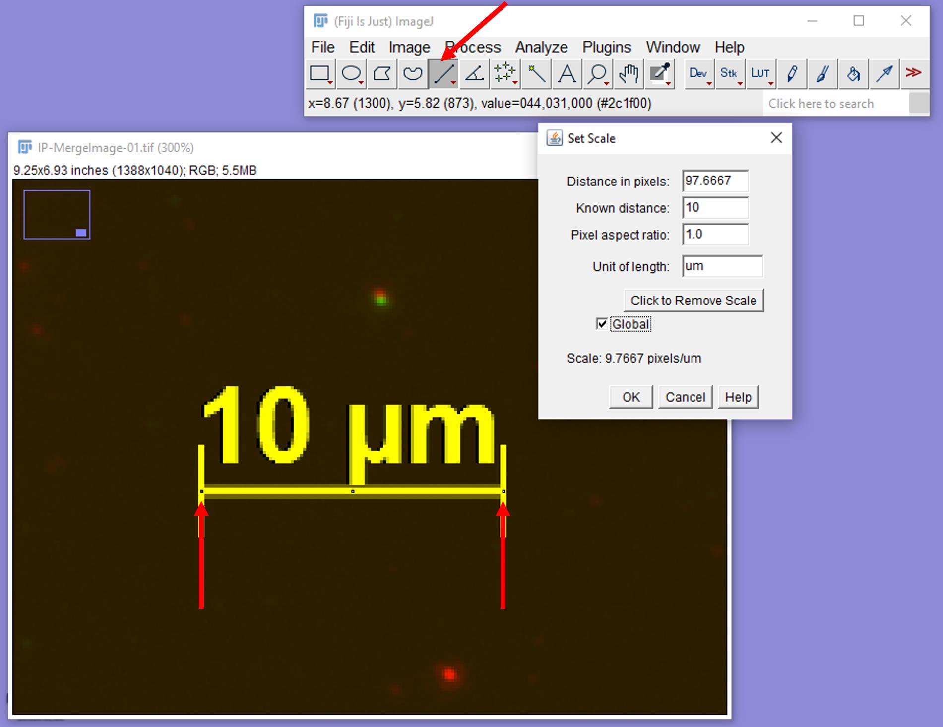 c. Click on Analyze--Set Scale. Enter the Known distance, Unit of length, and check the Global option. Click Ok (see Figure 8). Now your images are calibrated to the appropriate scale.