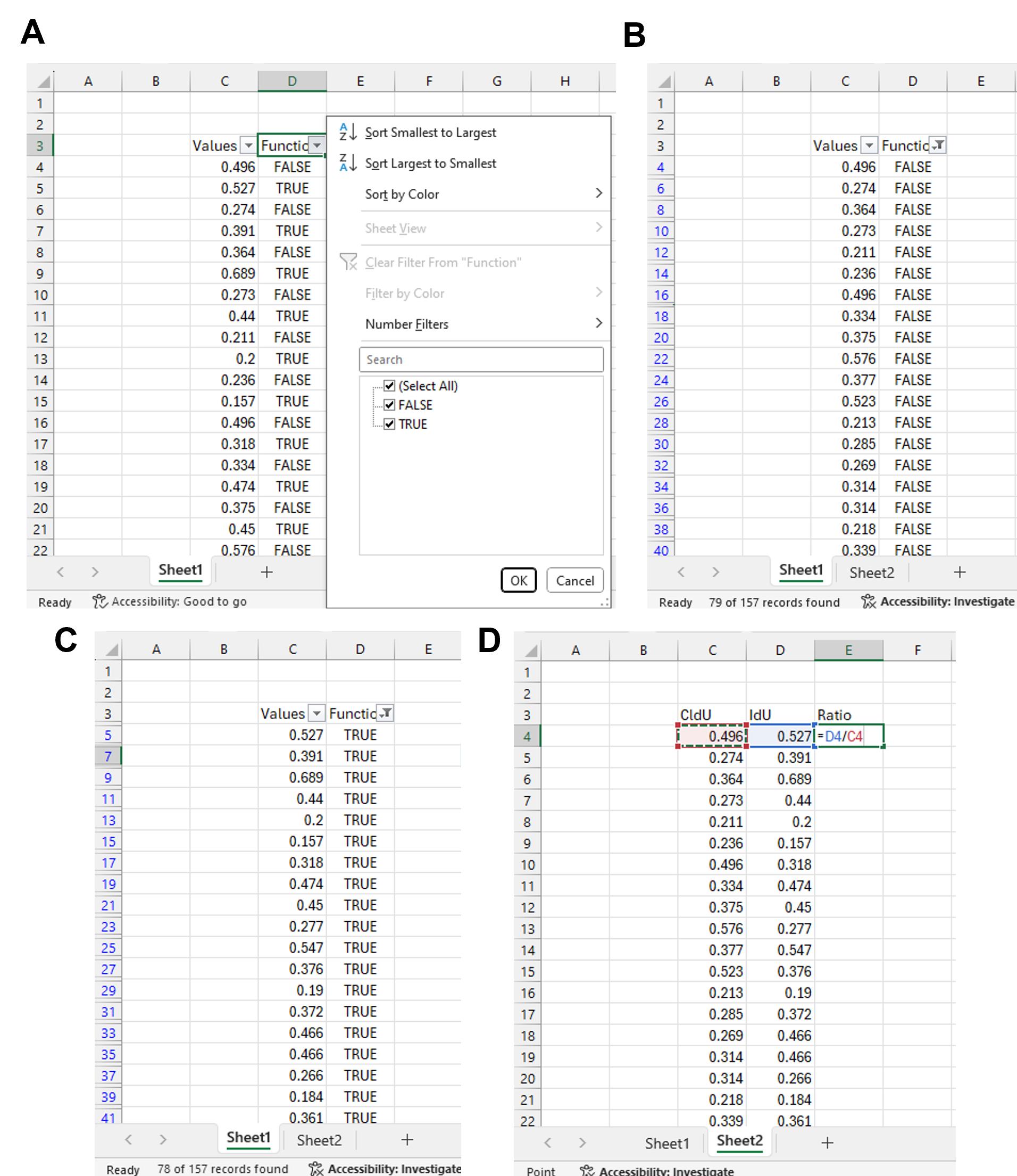 f. Now, only the rows corresponding to FALSE will be displayed. This will correspond to either CldU or IdU length values, depending on which one was measured first. Select all the FALSE rows and copy and paste them onto a fresh Excel sheet in a column labeled as CldU or IdU (Figure 11B, D).