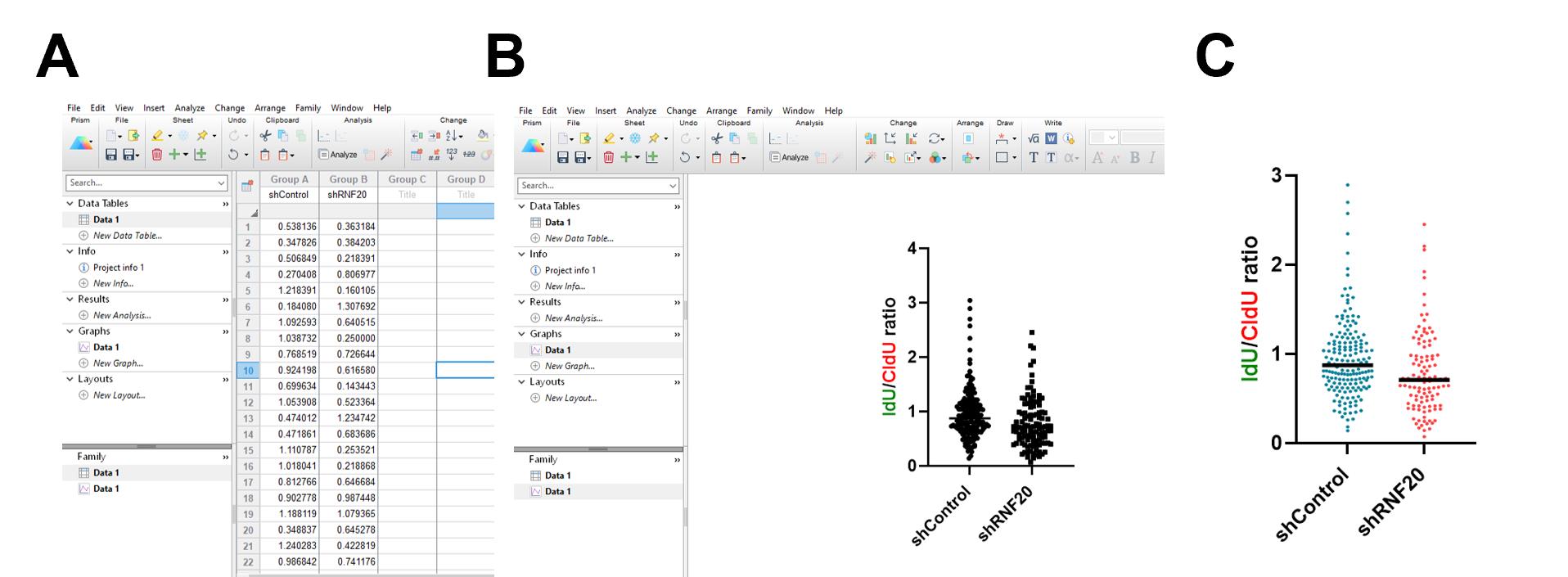 b. A blank spreadsheet will open. Enter the names of the columns in the column headers according to your samples. Copy and paste the numerical values (e.g., IdU/CldU ratio, replication rate, etc.) of each sample from the Excel file onto the Prism spreadsheet (Figure 12A).