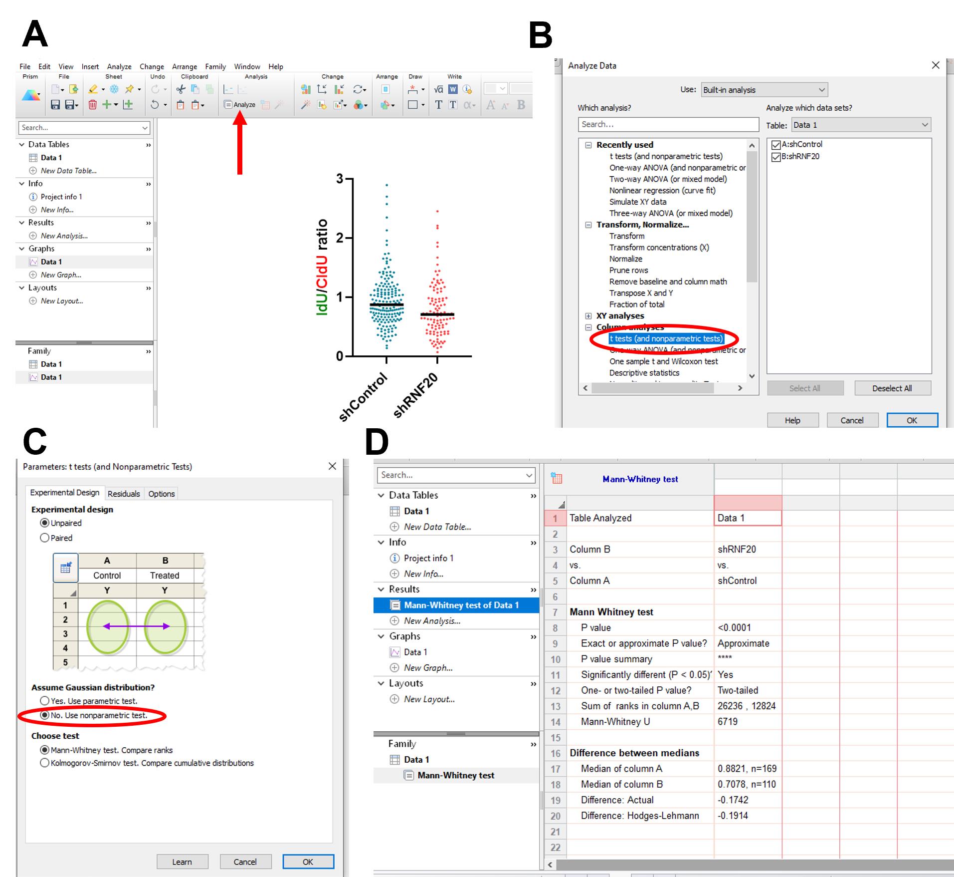 c. Under Experimental design, select Unpaired t test. Under Assume Gaussian distribution? select No. Use nonparametric test. Under Choose test, select Mann-Whitney test. Click Ok (Figure 13C).
