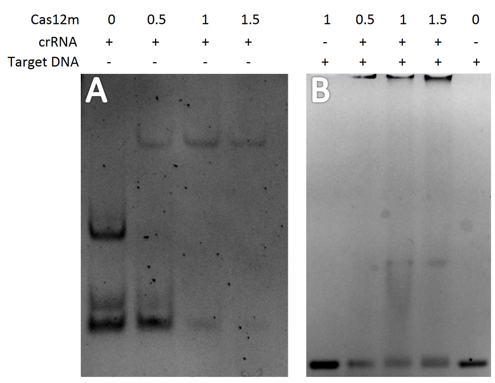 Figure 4. Analysis of Cas12m complex formation. (A) Binary Cas12m-crRNA complexes. (B) Ternary Cas12m-crRNA-DNA complexes.