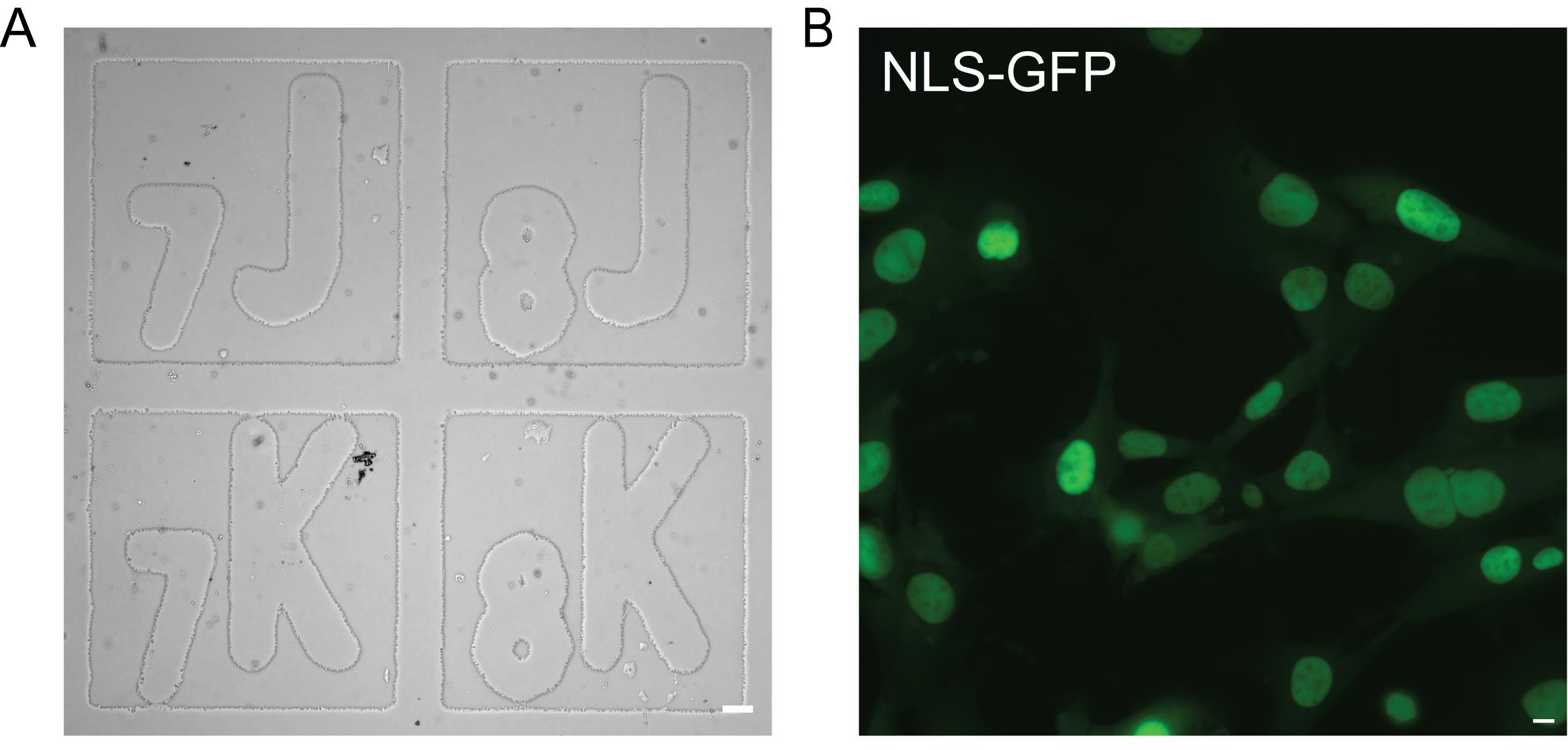 Figure 1. Gridded dish preparation for time-lapse imaging. (A) Representative image of a gridded dish in a coordinate-oriented right side up under transmitted light (scale bar = 50 μm). (B) Representative image of a field of view of MEF WT NLS-GFP cells in a coordinate under fluorescein isothiocyanate (FITC) light (excitation 498 nm, emission 517 nm) (scale bar = 10 μm).