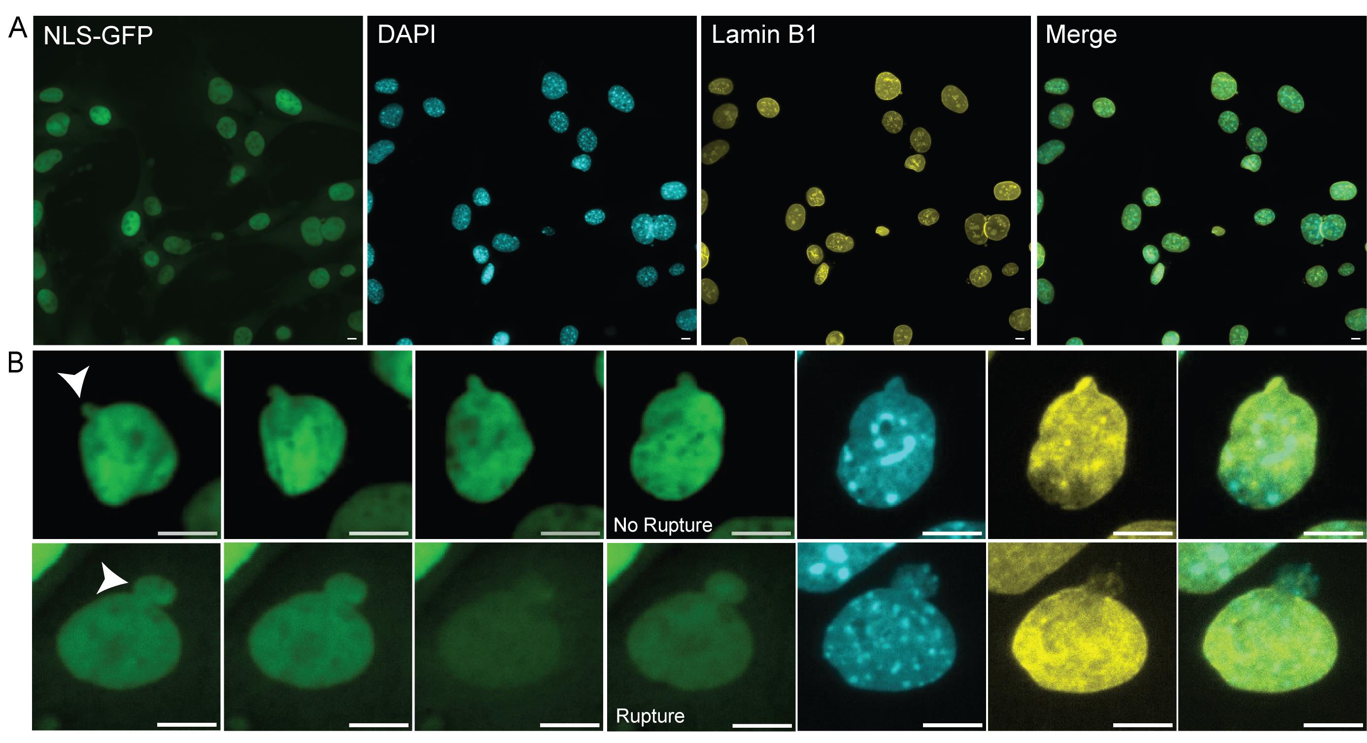 Figure 2. Matching time-lapse field of view during immunofluorescence imaging. (A) Representative image of the last frame of a time-lapse field of view under fluorescein isothiocyanate (FITC) light (excitation 498 nm, emission 517 nm). Matching immunofluorescence images stained with Hoechst, lamin B1, and merged. Scale bars, 10 μm. (B) Top row: example images from time-lapse imaging of a blebbed unruptured nucleus and subsequent immunofluorescence (NLS-GFP images from time 0, 1, 2, and 3 h; white arrow denotes bleb). Bottom row: example images from time-lapse imaging of a blebbed ruptured nucleus and subsequent immunofluorescence (NLS-GFP images from time 0, 2, 4, and 16 min; white arrow denotes bleb). Scale bars, 10 μm.