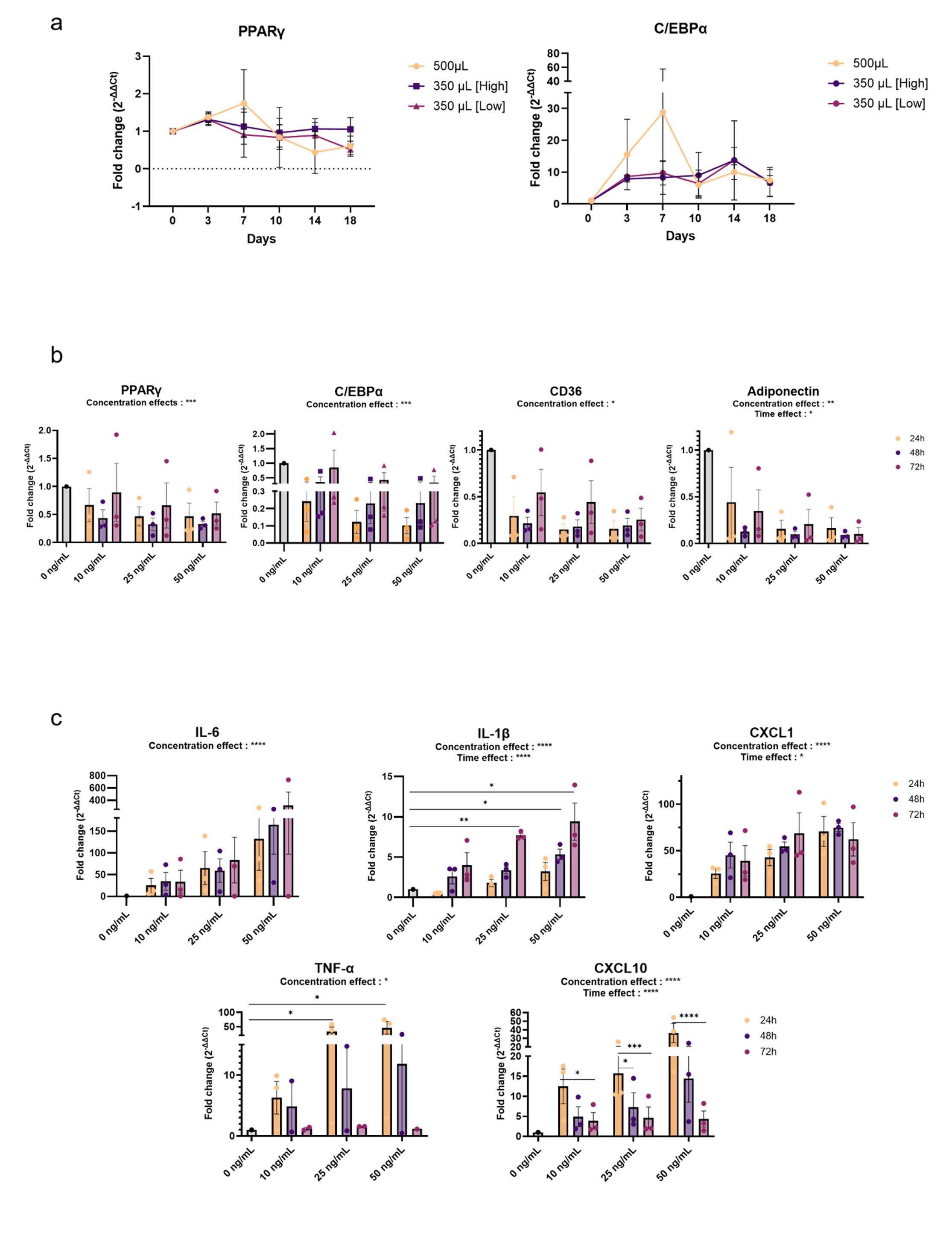 In contrast, we found the induction of pro-inflammatory cytokines mostly in a dose- and time-dependent manner, signaling the acquisition of a pro-inflammatory phenotype as adipocytes dedifferentiate. IL-6 expression was increased up to 300-fold compared to control (Figure 2c). CXCL1 and CXCL10 expressions increased up to 70-fold in comparison to control, so did IL-1β and TNFα expressions, although to a lesser extent (Figure 2c).