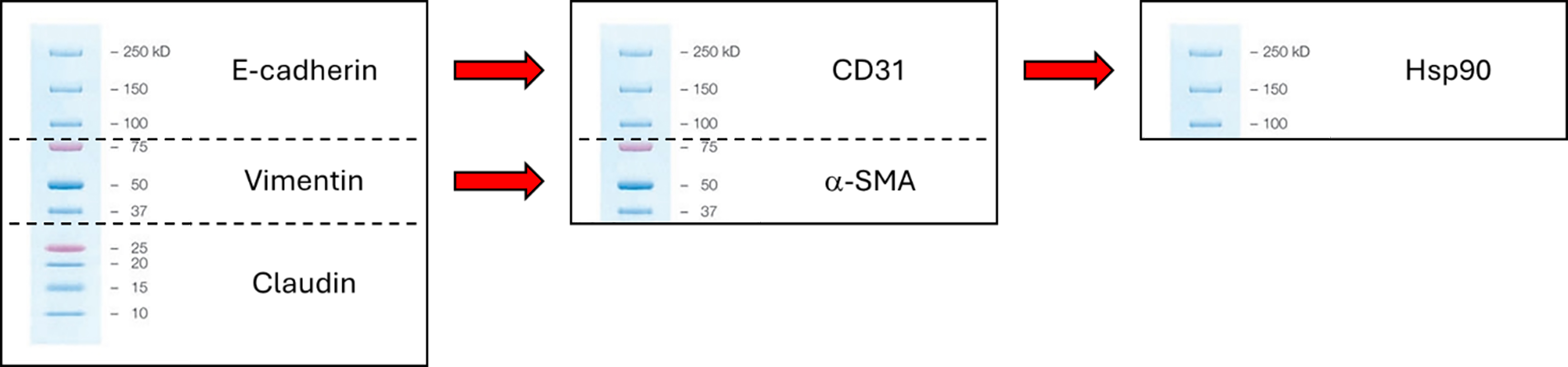 For western blot analysis (Figure 2), samples were loaded once on a single 4%–20% Mini-PROTEAN® TGXTM precast protein gel. Each well was loaded with 15 μg of total protein for each sample. The PVDF membrane was cut as indicated by the dashed line. Red arrows indicate stripping and reprobing of the PVDF membrane section. Following the transfer of proteins on the PVDF membrane, we first analyzed the expression of E-cadherin, Vimentin, and Claudin proteins, as reported on the panel above. Following signal acquisition, membranes were washed twice with T-PBS and stripped with Euroclone StripABlot buffer (15 min in horizontal oscillation). Membranes were then washed again twice with T-PBS and immediately re-incubated with CD31 and alpha-smooth muscle actin (α-SMA) antibodies. The stripping and reprobing procedure was repeated the following day to allow the detection of the Hsp90 signal. Col1a1 expression was analyzed in a second moment on a separate gel. The outcomes of these analyses, illustrating contamination levels and cancer-associated fibroblast (CAF) activation, are presented in Figure 3.
