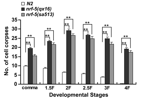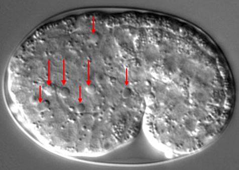 During the development of the C. elegans hermaphrodite, 131 of the 1090 somatic cells generated undergo programmed cell death, among which 113 die during embryogenesis starting from 200-cell stage. The apoptotic cells (also called “cell corpses”) appear as highly refractile button-like objects and are easily identified using differential interference contrast (DIC) optics (Robertson et al., 1982).