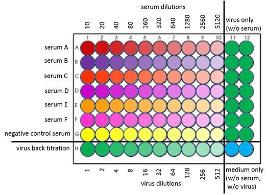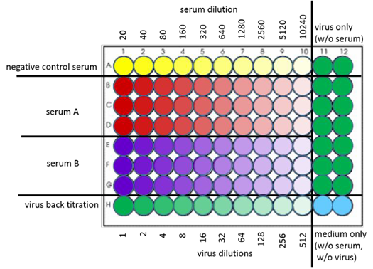 • Negative control I (virus): lanes 11 and 12 remain serum-free (only filled with 90μL DMEM) as control for each tested serum (reference value for ffu calculation)