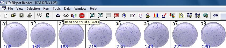 The neutralizing activity of a test serum is determined by its ability to reduce the number of virus foci compared to the number seen in negative controls. As negative controls act row A in every inoculation plate (negative serum with virus; see figure 2) as well as the lanes 11 and 12 in each inoculation plate (virus only). Additionally, the virus concentration used for infection/neutralization can be controlled by using the back titration calculation*. A reduction of plaque count of 50% is taken as the neutralizing end point (FRNT50 titer). A reduction of plaque count of 90% is taken as the neutralizing end point (FRNT90 titer).