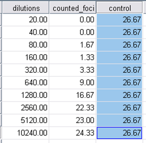 e.g. 16 foci counted in well H2 (= dilution factor 2): 16 ∙ 2 ∙ 40 = 1280 𝑓/𝑓𝑢 𝑚𝑙