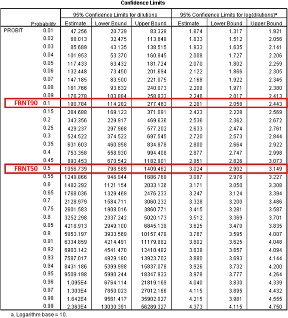 Determine the FRNT50 or FRNT90 titer by linear regression (probit) analysis using either probit paper or a computer software program, or determine highest dilution that results in ≤50% or ≤90% of input plaque count respectively.