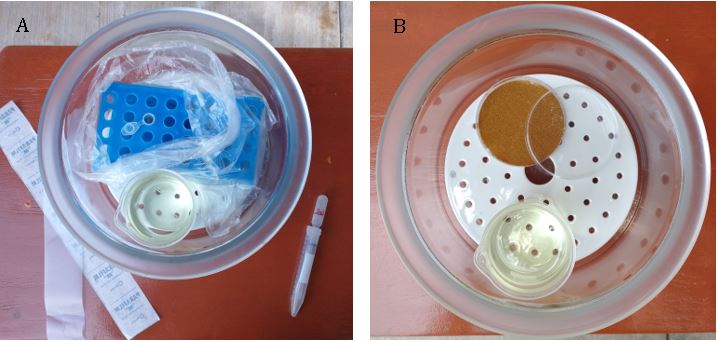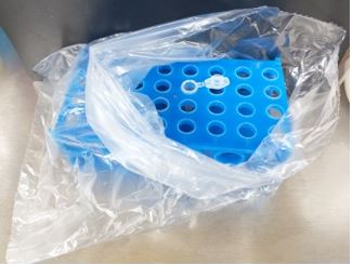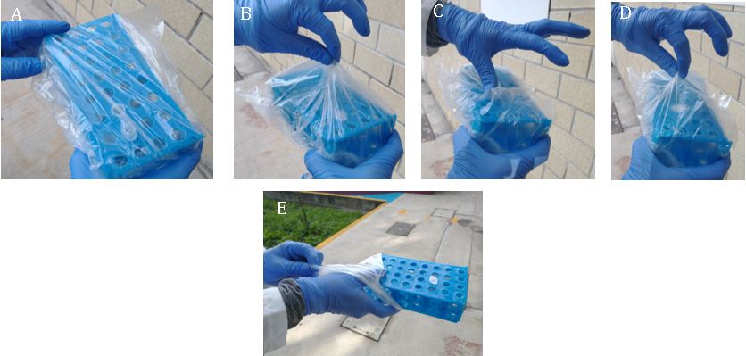 2.Put the rack with the tubes into a bag of the appropriate size so that it can be closed quickly when the disinfection chamber is opened (Fig 2). In the case of Petri dishes, it is not necessary to use a bag.