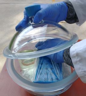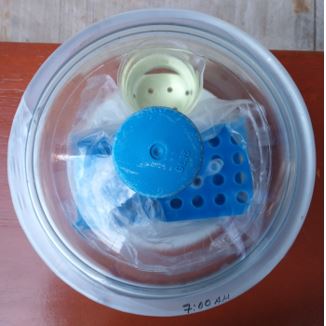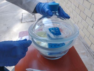 6. Wait for the gaseous chlorine to act for 4 hours. Alternatively, if you need to sterilize less than 300 seeds per tube, one hour of exposure will be enough for the chlorine to do its disinfecting job. Don't forget to label the time you sealed the desiccator on the Parafilm paper (Fig 6). See note 3.