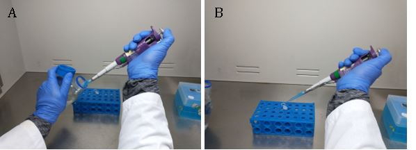 4. In a laminar flow hood (widely recommended), or in a burner, open the tubes so that the gas inside is purged. 15 minutes of ventilation is enough for the gaseous chlorine to escape (Fig 9). See note 5.