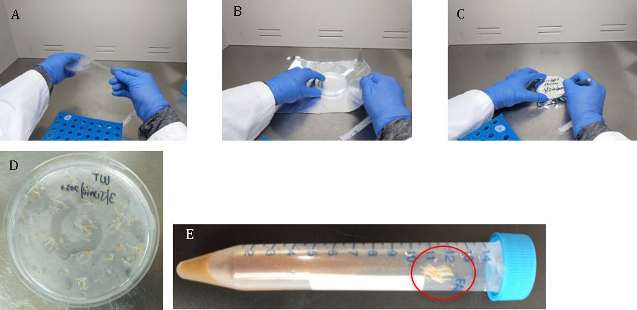 4. Seal the dish with Parafilm paper, wrap them in aluminum foil to prevent them from receiving light, and keep them refrigerated at 4 °C for 2 days (It is not recommended to store for more than a week.), or alternatively, incubate them directly at 25 °C. See note 8. After 10 days of incubation, your plants should be ready for transplanting (Fig 12).