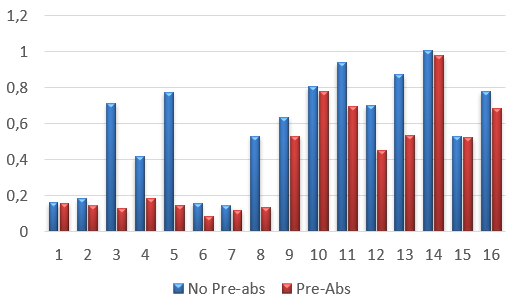Fig. 2. Elisa analisys. Blue bars represents the bovine´s serum without pre-absortion and red ones represents bovine´s serum after the method of pre-absortion using the powder extract of E. coli. Samples 1-8 corresponds to bovine´s serum negative for brucella sp. and samples 9-16 are bovine´s serum positive for brucella sp.