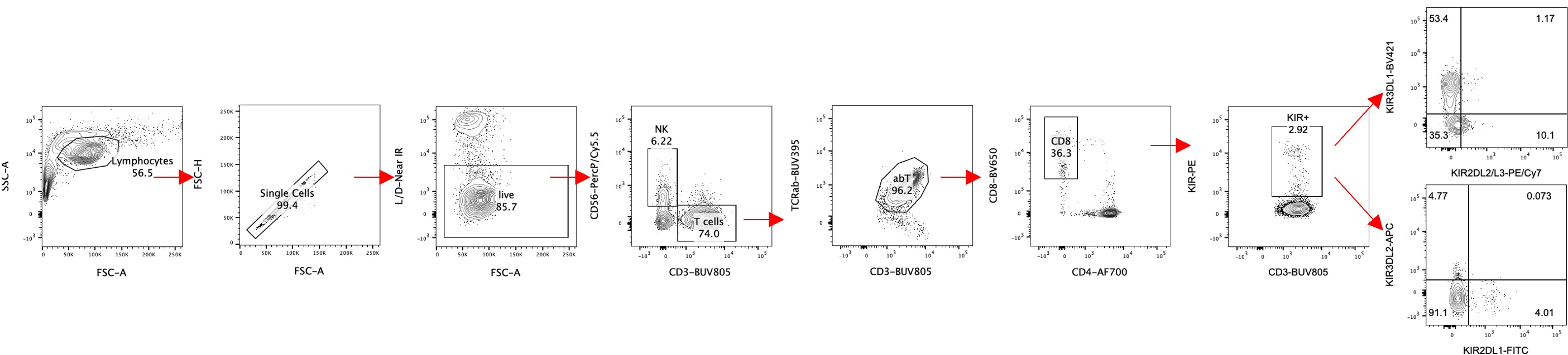 Make an antibody master mix of 1 μl of anti-CD3-BUV805, 1 μl of anti-CD56-PercP/Cy5.5, 1 μl of anti-CD4-Alexa Fluor 700, 1 μl of anti-CD8-BV650, 1 μl of anti-TCRαβ-BUV395, 1 μl of anti-KIR3DL1-PE, 1 μl of anti-KIR2DL2/3-PE, 1 μl of anti-KIR2DL5-PE, 2 μl of anti-KIR2DL1-PE, 2 μl of anti-KIR3DL2-PE, 1 μl of anti-KIR3DL1-BV421, 1 μl of anti-KIR2DL2/3-PE/Cy7, 2 μl of anti-KIR2DL1-FITC, 2 μl of anti-KIR3DL2-APC and 0.5 μl of LIVE/DEAD™ Fixable Near-IR Dead Cell Stain per 100 μl staining volume. Add 18.5 μl of the antibody master mix per 81.5 μl PBMCs. Incubate at 4oC for 30 min.
