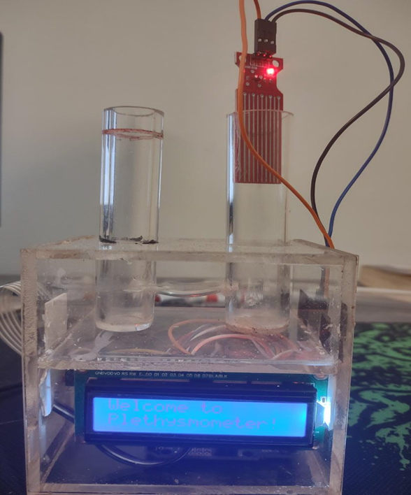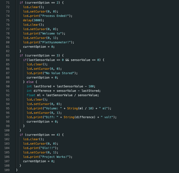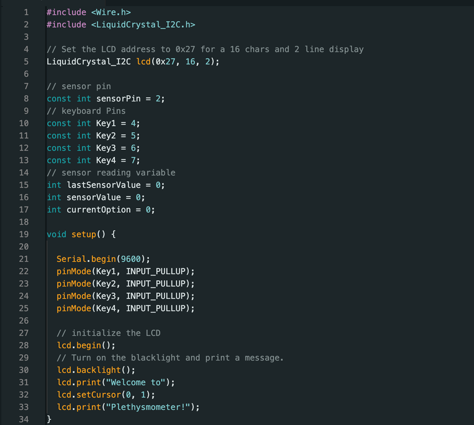 A system with a sensor, keypad buttons, and a liquid crystal display (LCD) is managed by this Arduino program. Plethysmography is a technique used to monitor changes in volume of an organ or bodily component, and it is likely that this is how the system works.
