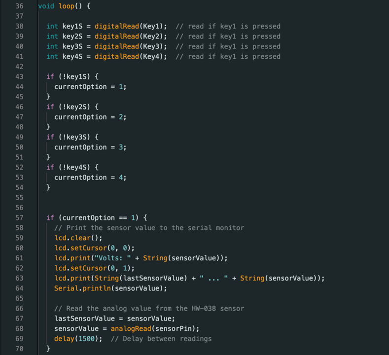This Arduino sketch's loop() method constantly monitors for button pushes and changes the currentOption variable as necessary. The states of the keypad buttons Key1, Key2, Key3, and Key4 are tracked using digitalRead(). A button's currentOption is changed to the appropriate value (1, 2, 3, or 4) if it is pushed.