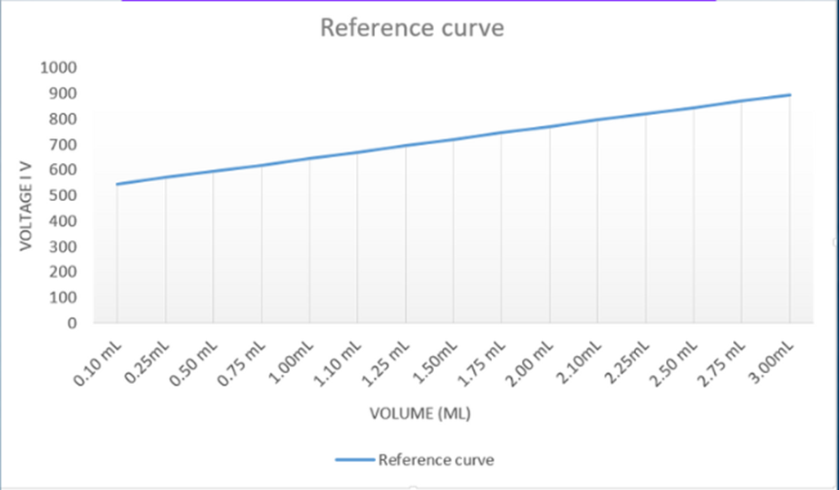 A common way for translating voltage measurements from sensors into useful quantities, such volume, is the standard curve method. Using this technique, a calibration curve is created by taking measurements of well-known reference volumes and recording the related sensor results. The resultant curve shows the link between the physical amount (volume) and the sensor output (voltage). Subsequent voltage measurements can be precisely translated into volume units by utilizing this calibration curve.