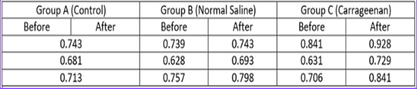 Three sets of albino mice were used in a real-time test to gauge the water displacement sensor's usefulness and efficacy. Group A (Control), Group B (Normal Saline), and Group C (Carrageenan) were used to divide the mice. The goal was to gauge the volume changes in the mice's paws following the injection of various drugs.