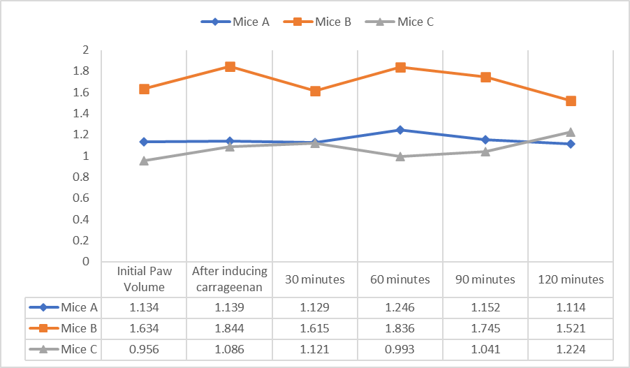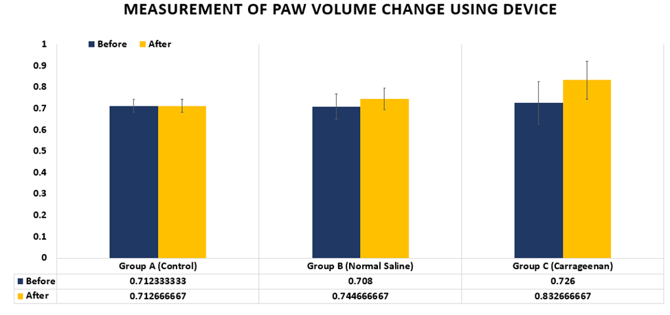 The water displacement sensor device's data from the real-time test revealed unique volume changes in the mice's paws in reaction to the administered drugs. No volume changes were seen in Group A (Control), where no substance was given, during the test time. This showed that the water displacement sensor gadget successfully discriminated changes brought on by the injected drugs from natural variations and accurately recorded the baseline data. The mice in Group B (Normal Saline) experienced transitory and mild volume changes after receiving a paw injection of 1 ml of 0.9% saline solution. The fact that these variations fell within the range of a typical saline injection shows how sensitive the water displacement sensor device is to even minute changes in paw volume. Significant and long-lasting volume changes were seen in Group C (Carrageenan), where the mice received 0.1 ml of 1% Carrageenan in the paw. The inflammatory reaction in the mice paws was successfully recorded by the water displacement sensor device because carrageenan is known to cause inflammation. The capacity to precisely gauge volume changes in real-time offers useful data for assessing the efficacy of anti-inflammatory medications. Overall, the outcomes of the real-time test showed that the water displacement sensor device is effective at detecting and measuring volume changes brought on by inflammation. In order to monitor and evaluate the efficacy of proposed treatments, this gadget can be a useful tool in anti-inflammatory drug testing.