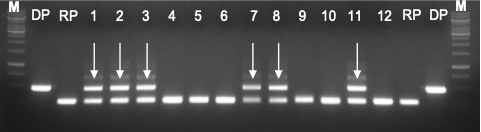 Figure 5. Confirmation of heterozygosity in F1 generation by gene-specific markers (foreground selection). M: 1 kb Plus ladder; DP: Donor parent, 270 bp; RP: Recipient parent, 150 bp; Arrow indicates heterozygous for both parents 270/150 bp.