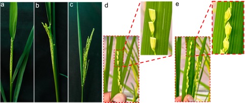a: No panicle exsertion; b: 40% panicle exsertion; c: >70% panicle exsertion; d: emasculated spikelet; e: cross cutting of spikelet